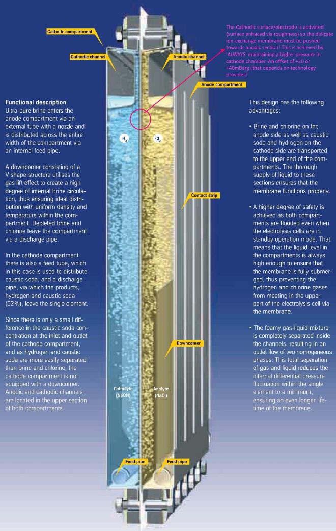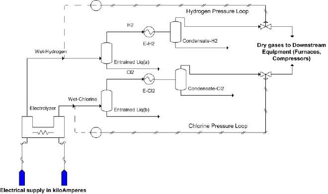 The behavior of gas pressure loops for both H2 & Cl2 are of utmost importance; where Pressure.H2 > Pressure.Cl2 by an amount of at least 5mBarg. If this isn’t ensured a mere ~3mm membrane integrity will be compromised; in a given cell this can lead to short-circuiting b/w H2 & Cl2 gases. The reaction is highly exothermic & your electrolyzer will turn into an explosive!