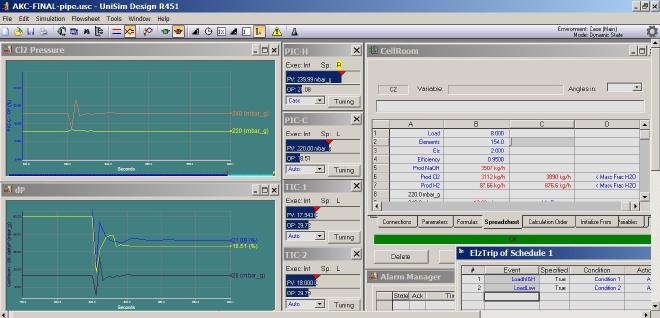 Utilizing Event Scheduler x2 process disturbances are simulated & ΔP profile (black line) is audited. Pressure controlling valves (for both Cl2 & H2) are tuned (& or detuned) to make sure ΔP remains either above 5mBarg or b/w 2-5mBarg for no more than 5sec. Alarm Manager is configured to trigger at ΔP < 5mBarg