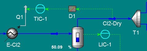 Above is a stripped down version of electrolyzer x2 gas pressure loops. Electrolyzer is a unique equipment because the products (Cl2 & H2) are produced via applying DC current of magnitude of several kiloAmperes (kA). Mass flowrates can be computed via Faraday’s law equation. In HYSYS/UNISIM this present a problem of flow-driven dynamic simulation where flowrates are solely dependent on the amount of current applied & the pressures generated are proportional to system volumes & downstream pressures. The latter is dictated by gases consumption by downstream equipment.