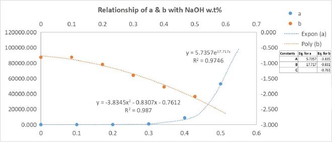 Now we need to so second regression that is variation of a & b with respect to NaOH mass fractions because after all viscosity of brines are dependent on x2 variables (temperature & solute mass fraction)