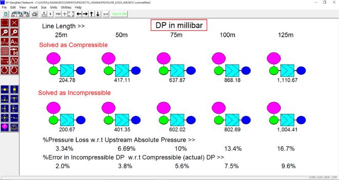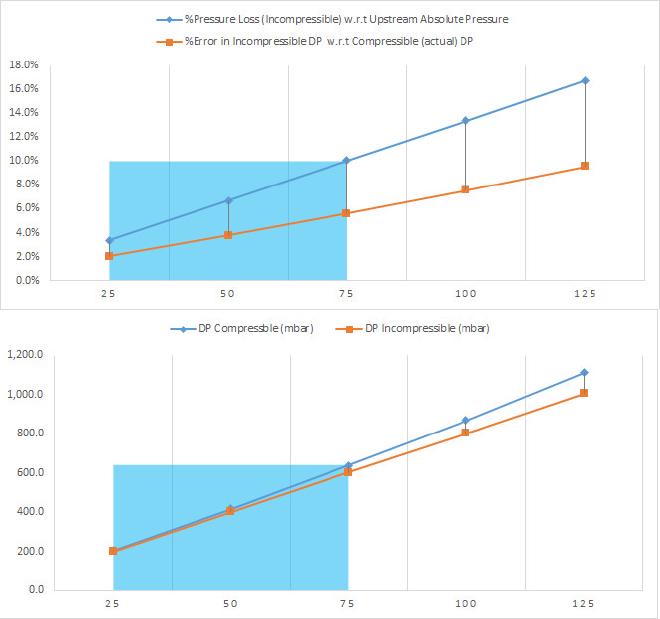 Analyzing the results especially the 2nd graph gives the idea that pressure drop calculation from both compressible & incompressible equations within the 10% envelope yields similar results but the difference/error after that is increasing; justifiably displayed by the increasing gap between the two lines.