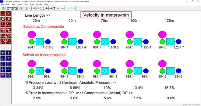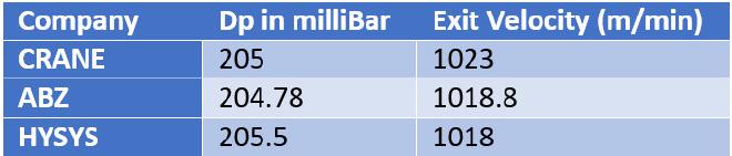 Pipe lengths (with same geometry) are increasing with 25m increment from 25m to 125m & one can see that for compressible case the dP (pressure drop in mBar) as well as exit velocities (in m/min) are very much similar for both ABZ & HYSYS. For the 25m case common to all three the comparison is