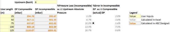 Pressure drop for the compressible flows would be badly under-estimated if the Incompressible (i.e. Liquid) model are used beyond the 10% envelop.