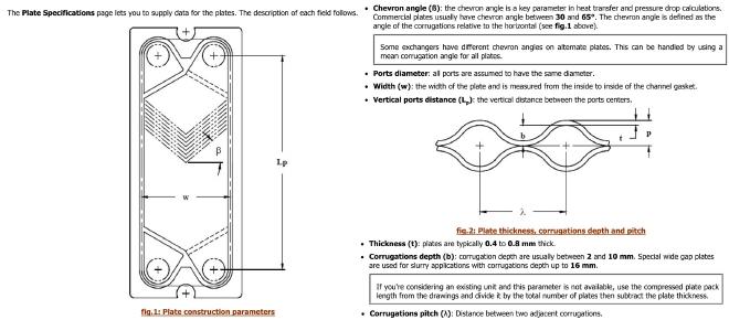 Care must be exercised when inputting mechanical specifications in PHE Works. Timmerhaus & Sinott while phrasing plate distance/spacing clearly means the flow region available to the fluid. There is no input box for Plate Spacing in PHE Works as a workaround we will study above picture taken from its help manual. It can be seen that