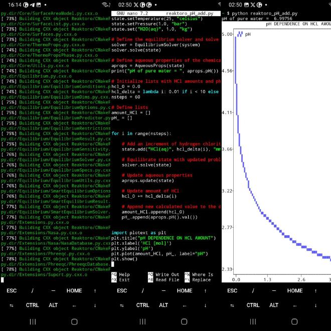 It took several hours compiling python library Reaktoro on my Android (using termux). With the aid of plotext library you can make some stylish graphs within terminal without invoking jupyter. Being in chloralkali industry one needs special thermodynamic libraries dealing with ionic phase equilibria.